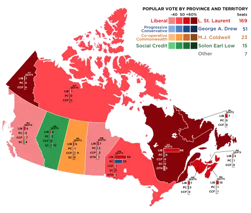 The Progressive Conservative Party, led by former Premier of Ontario, George Drew, formed the official opposition, but for the last time until 1993, the party was unable to win the popular vote in any of Canada's provinces or territories.