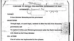 In August 2013, on the 60th anniversary of the coup, the US government released documents showing they were involved in staging the coup. The documents also describe the motivations behind the coup and the strategies used to stage it.[11] The UK had sought to censor information regarding its role in the coup; a significant number of documents about the coup remained classified.[31] The release of the declassified documents, which marked the first US official acknowledgement of its role, was seen as a goodwill gesture on the part of the Obama administration.[93][31] According to Aljazeera, the deputy director of the National Security Archive, Malcolm Byrne, disclosed that the CIA documented the secret histories purposely for official use.[94]