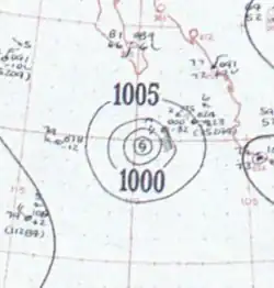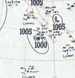 Ships reports from the Hawaiian Islands to Panama indicated that an area of disturbed weather formed just west of the Revillagigedo island group. Initially, evidence of closed wind circulation was insufficient to warrant an upgrade into a tropical disturbance. By the afternoon, pressures in the region began to fall. By that night, it was estimated to have developed winds of 40 mph (65 km/h).[3] A tropical storm formed on September 9;[6] meanwhile, ship reports indicated a pressure of 1,001 mbar (29.6 inHg) and sustained winds of 50 mph (85 km/h).[3] Maintaining peak intensity for a day, the low moved northwest before dissipating on September 10 as[6] barometric pressures began to rise. The remnants of the storm later brought rain to Central California on September 15.[3]