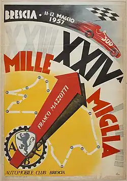 The 24. edizione Mille Miglia (Italian for "One Thousand Miles") was an auto race held on a course totalling 992.332 miles (1,597.004 km), made up entirely of public roads around Italy, mostly on the outer parts of the country on 11–12 May 1957. The route was based on a round trip between Brescia and Rome, with start/finish in Brescia. It was the 3rd round of the 1957 World Sportscar Championship season.[1]