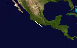 The season's eleven known storm identified several hundred miles south of Mexico on October 17. Quickly tracking northwestward, the storm attained an intensity of 85 mph (135 km/h) during its existence. Early on October 19, the hurricane turned due north, brushing the coastline of Mexico before dissipating just offshore the following day.[2]