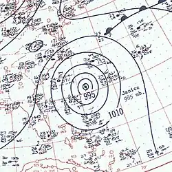 A ship on September 4 indicated a tropical depression developed from a tropical wave to the east of the Lesser Antilles. The system initially had two circulations that consolidated into one by September 5. That day, Hurricane Hunters observed 55 mph (89 km/h) winds, which prompted the Weather Bureau to upgrade it to Tropical Storm Fifi.[1] Due to the storm's fast track to the northwest, a gale warning and hurricane watch were issued for the Leeward and northern Windward Islands.[27] On September 6, Fifi intensified into a hurricane and reached peak winds of 85 mph (137 km/h), around the same time that it passed about 150 mi (240 km) northeast of the Leeward Islands.[1] Later, Fifi began weakening, and by September 8 it was downgraded to tropical storm status.[12] The westerlies turned Fifi to the northeast on September 10.[1] After passing southeast of Bermuda, the storm dissipated on September 11.[12]