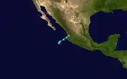 Tropical Storm Five existed from July 26 to July 30. A tropical storm about 140 mi. west of Acapulco, Mexico was located in the 26th. This storm had winds of 45 to 55 kt. from the time if its identification until the 29th. It moved northwestward off the coast of Mexico finally breaking up into an area of squalls near 26N 117W on the 30th.[5] The storm spread moisture and rainfall into southern California, reaching 2 in (51 mm) at Barton Flats. Floods and mudslides covered five cars, inundated a portion of U.S. 66, and entered a few buildings.[6]
