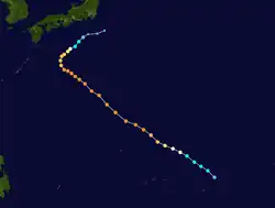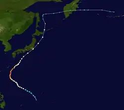 Tropical Storm Alice developed on July 14 in the open western Pacific Ocean. It moved to the northwest and attained typhoon status on the 16th. Alice rapidly intensified on the 19th to a 150-mile-per-hour (240 km/h) super typhoon, and after turning to the northeast it weakened. Alice hit southeastern Japan on the 22nd, and became extratropical on the 24th near the Kamchatka Peninsula.[5]