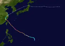 On May 29, Super Typhoon Phyllis attained a peak of 185 miles per hour (298 km/h), the strongest typhoon on record in May at the time.[4] Phyllis remained over open waters, and dissipated on June 2, southeast of Japan.