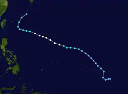 At noon on December 31, a vortex was noted along the Intertropical Convergence Zone about 1,300 miles (2,100 km) south of Hawaii. On January 7, the relatively small tropical storm struck Jaluit Atoll within the southern Marshall Islands, killing 14 people. It rapidly intensified, and reached winds of 140 miles per hour (230 km/h) the next day. Conditions became unfavorable, and steadily weakened to 105 miles per hour (169 km/h) winds. Ponape was struck on January 10, where Ophelia tore off the roof of the United States Weather Bureau office. On January 11, Truk was struck. The Weather Bureau's inflation shelter was destroyed, with other buildings on site severely damaged. On the 12th, favorable conditions allowed Ophelia to reintensify, reaching a peak of 160 miles per hour (260 km/h) on the 13th. Ophelia severely impacted Yap, removing the Weather Bureau office's sheet metal roof and damaging the inflation building, theodolite, and radio antenna.[1] After maintaining that intensity for 18 hours, it quickly weakened as it drifted northward, and dissipated on the 17th. Typhoon Ophelia caused widespread damage on several islands of the Western Pacific.[2] Ophelia also killed nine people when a USAF WB-50 crashed during a recon flight into the storm on January 15.[3]