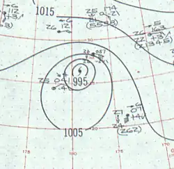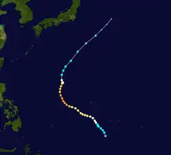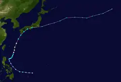 On August 1, a well-developed low pressure area and easterly wave accompanying the area was detected northwest of Guam. Following the discovery of an eye in the system, the area was designated as Tropical Depression Ellen by the JTWC at 06:00 UTC of August 2.[2] Ellen intensified into a tropical storm four hours later, before consolidating further into a typhoon 24 hours after. On August 4, as Ellen moved northwestward, the storm reached its peak intensity while located 320 km (200 mi) south-southeast of Okinawa, attaining winds of 185 km/h (115 mph).[17] Taking an erratic path, Ellen proceeded to decelerate off the coast of Kyushu. A strong ridge to the north prevented Ellen from further movement for approximately 46 hours. During that time, a recon aircraft measured the very large eye at 160 km (100 mi). The ridge then weakened, allowing the typhoon to accelerate in an east-northeast direction.[2] By August 8, Ellen had weakened into a tropical storm. Ellen moved along the south coast of Japan, passing directly above its capital city Tokyo. The storm entered the open sea east of Honshu on August 9, before transitioning into an extratropical cyclone.[17]