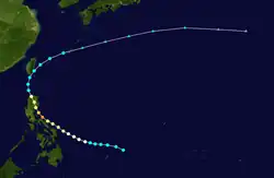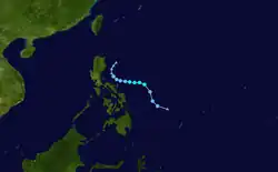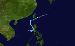 On August 18, a tropical disturbance on the ITCZ was found on a surface chart, possessing a weak circulation. However, later on August 20, a recon aircraft was sent to the center of the system, and recorded typhoon strength winds. Typhoon Iris passed north of Luzon, where it steered west-northwestward, subdued from going more north by a strong high. The high gradually weakened, beginning Iris's recurvature toward the northwest.[2] The typhoon's winds then peaked at 170 km/h (105 mph) on August 22, before they weakened to tropical storm strength.[24] The storm moved over the coast of China near Kao-Chi, where it rapidly became extratropical and dissipated on August 23.[2]
