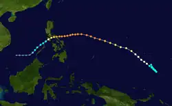 A surface circulation was found northeast of Guam on August 23. The system was classified as a tropical storm at 02:35 UTC of August 25, and quickly strengthened into a typhoon within 23 hours.[2] Moving in a northwest direction, Joan proceeded to rapidly intensify to winds of 315 km/h (195 mph) and deepened to sea-level pressure of 885 hPa (26.13 inHg) on August 29, becoming the 11th most intense tropical cyclone and the most powerful storm of the season.[26] Such winds are dubious, due to the infancy of reconnaissance aircraft at the time and the lack of satellite images. Nevertheless, Joan was a powerful typhoon, and struck eastern Taiwan with estimated winds of 185 mph (298 km/h). The mountainous terrain in Taiwan induced a weakening effect on Joan as the storm's center moved above the island, before passing through the Chinese mainland on August 30, before rapidly dissipating inland. During its lifespan, Joan was at one point a huge storm, extending to 1,600 km (1,000 mi) in diameter, with 90 km/h (55 mph) winds spanning up to a radius of 480 km (300 mi).[2]