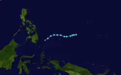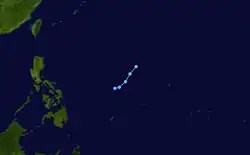 The first tropical storm of the season was detected on February 27 about 300 miles (480 km) south of Yap with winds of 60 miles per hour (97 km/h). Moving erratically westward, Ruby maintained intensity until it passed 90 miles (140 km) south of Palau on February 28, when it began to weaken and move to the west-northwest. Ruby weakened to below tropical storm intensity on March 1 and then turned to the southwest. It dissipated later on the same day 300 miles (480 km) east of Mindanao.[4]