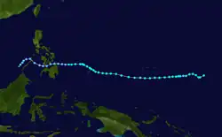 Of the 33 tropical cyclones and 65 total areas of investigation, 18 storms attained typhoon status, which was below the yearly average of 19.[2] At least nine other tropical systems never exceeded tropical storm intensity operationally. Most of the systems were noted to have developed within the typical spawning grounds for typhoons originating from easterly waves within the Intertropical Convergence Zone; the exceptions were Ellen and Georgia which developed from cold-core troughs extending southward into the tropical latitudes. Of the 18 typhoons that formed, five were first detected within 300 miles (480 km) of the island of Guam. Three of the typhoons developed at a slow rate, while three others rapidly intensified to typhoon status within hours. Only four typhoons were small in diameter, while at least three typhoons developed to large sizes and became the dominant tropical features during the season. Two of the typhoons — Joan and Vera — featured sea-level pressures below 900 millibars and were the most intense tropical cyclones during the season, each featuring winds of 190 mph (305 km/h) or greater.[3] Of the total number of typhoons, 215 reconnaissance missions were flown into the storms, including 3,799 observations and 391 total fixes. The average track error for each advisory for storms during the season was 63.9 miles (102.8 km) for 12-hour forecasts and 301.6 miles (485.4 km) for 48-hour forecasts.[2]