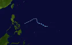 Tilda attained its peak intensity of 145 mph (233 km/h) 400 miles (640 km) west of Guam on April 19, and it slowly weakened as it turned north-northeast and decreased in forward speed.[6] The typhoon became quasi-stationary for 30 hours on April 20, weakening to a minimal typhoon in the process by the next day. After drifting under weak steering currents, Tilda accelerated to the north-northeast on April 22 and weakened to a tropical storm. Tilda dissipated on April 23 as it merged with the upper-level westerlies 130 miles (210 km) southwest of Iwo Jima, and overall stayed in the open ocean, causing no casualties.[2]