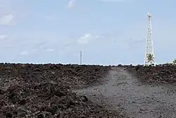 A community of 300 inhabitants, a school, churches, roads, and crops were destroyed and covered by several meters of lava that advanced out to sea, modifying the coastline by bringing Cape Kumukahi, Hawaii's easternmost point, a little further east.[6] After the lava had cooled, Kapoho was not rebuilt, except a few buildings southwest of the site of the former settlement, next to the lava flow.[8] The roads have been retraced, with the coastal road crossing the lava flow from one end to the other and the road to the Cape Kumukahi lighthouse via Kapoho following the old route.[8] Part of the lava flow, notably the mass of tephra formed on January 27, has since been exploited as a slag quarry not far from Koaʻe.[8]