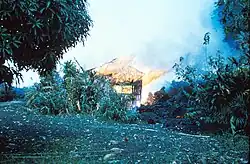 The first barrier to protect Kapoho proved ineffective but delayed the flow long enough for bulldozers to build a second dike, set back from the first, again between Puʻu Kukae and Kapoho crater. This "last chance" dike, built on January 23 and 24, was as ineffective as the first, being bypassed by the lava at 1:13 a.m. on January 27. The first houses were destroyed, consumed by the heat, and then crushed by the slowly advancing wall of lava.[6] Extending behind the lava front, a vast field of liquid lava threatened to engulf the village at any moment, should the edge of the flow break.[6] This catastrophic scenario will not occur but will be replaced by another when some of the fissures reactivate and spew ʻaʻā lava. The new flow quickly reached the gates of Kapoho and advanced into the town from the southwest, destroying every building in its path. At midnight on January 27, and after just thirty minutes, most of Kapoho was destroyed. The last two buildings still standing were swallowed up on January 30 in a final advance of the lava.[6]