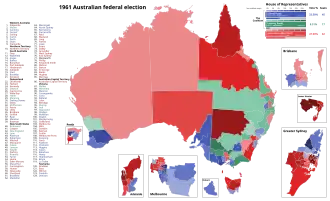For a long time, the 1961 election remained the closest Federal election in Australian history, with the Coalition being reduced to the barest majority. Despite not having a majority of seats in New South Wales and Queensland the Coalition retained all of their seats in Victoria and could retain power.[2] The election was decided in the seats of Bruce near Melbourne and Moreton near Brisbane where the Liberal Party won the seat by 130 votes due to Communist Party preferences.