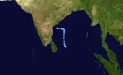 Cyclonic Storm One existed from May 14 to May 22.[3] The storm moved from east to west, forming on May 14 and slowly moving northward. On May 15, it started moving northwestward, then later westward as it strengthened. It made a landfall on northern Tamil Nadu, moving west-southwestward with 1-minute sustained winds of 40 miles per hour on May 16 after strengthening into a low-end tropical storm-strength tropical cyclone. It then crossed India and resurfaced in the Arabian Sea early on May 18, also turning northwest in the meantime. The storm spent the rest of its lifetime slowly moving northwest as a tropical depression, eventually dissipating on May 22 a few hundred kilometers south of Pakistan.
