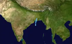 Deep Depression Two existed from May 24 to May 25.[4] The storm moved from south to north throughout its two-day lifetime. It first formed early on May 24 moving northward in the northeast Bay of Bengal, then started moving northeastward later in the day. The storm made a tropical depression-strength landfall on western Myanmar on May 25 and quickly dissipated afterward.