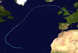 By late on September 12, the storm curved northeastward and passed to the northeast of Bermuda early the next day,[3] bringing 4.05 in (103 mm) of precipitation and wind gusts up to 70 mph (110 km/h).[29][30] Throughout the island, low-lying areas were flooded and trees were felled. At St. George's Island, residents were briefly left without electricity and telephones and the causeway linking St. George's Island to the main island was inundated.[31] Early on September 13, Ethel intensified into a Category 2 hurricane and soon peaked with winds of 105 mph (169 km/h). The system became extratropical late on September 14, while located about 255 mi (410 km) southeast of Cape Race. Newfoundland. The extratropical remnants slowly weakened while meandering around the Atlantic, until dissipating just north of the Azores on September 17.[3]