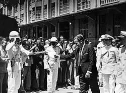 At the Navy Ministry, indignant admirals demanded that Minister Mota assert his authority.[125] A new invasion was planned, this time with the Riachuelo Battalion, based on Ilha do Governador.[126] Commanded by Frigate captain Helio Migueles Leão, it arrived at 4:00 pm. A platoon received tear gas. However, at 6:00 pm Admiral Sinay received the order to withdraw the troops:[121] nothing would be done without the order of the president, who was returning from São Borja. Negotiations remained, and continued throughout the day.[117]