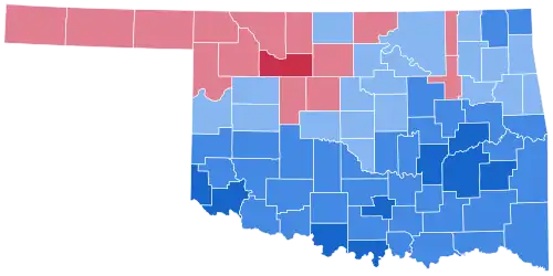 As of the 2024 presidential election, this is the last time that a Democratic presidential nominee has carried Oklahoma; the state is now overwhelmingly Republican.[2] Johnson was also the last Democrat to carry Oklahoma County (home to Oklahoma City), Cleveland County (home to Norman), Comanche County, Canadian County, Custer County, Noble County, and Payne County (home to Stillwater).[3] Despite this, Oklahoma would remain reliably Democratic at the state level for the next several decades.