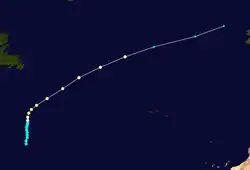 A cold front moved eastward from North America into the western Atlantic Ocean on August 28. An extratropical low developed on August 31 over the north Atlantic, which degenerated into a trough three days later. On September 4, another extratropical storm developed, located about 800 mi (1,285 km) south of Newfoundland. The system attained gale-force winds a day later, and turned westward on September 6, steered by a building ridge to the north. On September 7, the storm transitioned into a tropical storm, after its wind field became more symmetrical. Later that day, the storm attain winds of 60 mph (95 km/h), recorded by nearby ships. The storm turned to the east and northeast, crossing over its former path. On September 10, the tropical storm again transitioned into an extratropical storm, which later passed southeast of Newfoundland. The storm moved across the northern Atlantic Ocean, dissipating on September 13 southwest of Ireland.[4]