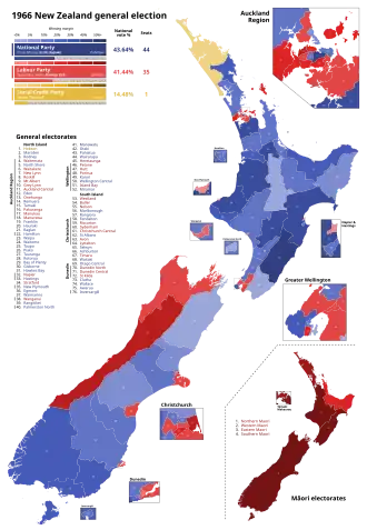 The 1966 election saw the governing National Party retain office by an eight-seat margin. It had previously held office by a ten-seat margin — the drop was a result of losing the Hobson seat to Social Credit's Vernon Cracknell. National won a total of forty-four seats, while the Labour Party remained static on thirty-five. In the popular vote, the parties were closer — National won 43.6% to Labour's 41.4%. The Social Credit Party won 14.5% of the vote and one seat.