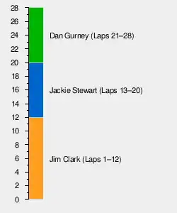 Jim Clark led off the grid from pole position and maintained that position for the first 11 laps and was 20 seconds ahead of Jackie Stewart and Dan Gurney when he had to come into the pits for a plug change, which cost him two minutes. Stewart built up a comfortable lead, helped even further when Gurney had to come into the pits with fuel pressure problems, losing another 20 seconds. However, it was now Stewart's time for mechanical problems as his gearshift was faltering. Gurney set a new lap record to catch and pass him 8 laps from the end and gain a maiden victory for the beautiful magnesium and titanium Eagle car. The light weight and advanced aerodynamics of the car made it very fast, and Gurney shattered Tony Brooks' record Grand Prix average of 143 mph (set some 8 years earlier) on his way to victory. The Eagle was timed at 196 mph on the back straight, an extraordinary speed for a car with an engine producing (at that time) something less than 400 h.p.