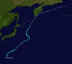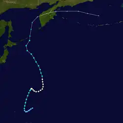 After recurving, Georgia traversed the open Pacific north of 30°N. By August 4, it weakened to a tropical depression, with winds dropping below 35 knots. The system transitioned into an extratropical cyclone by August 8, ultimately dissipating near the Kuril Islands on August 13.