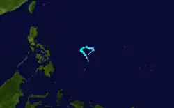 Therese emerged in the western Pacific on March 15 near the Caroline Islands as a tropical depression. Within 24 hours, it intensified into a tropical storm, moving steadily west-northwestward through the Philippine Sea. By March 18, Therese reached its peak intensity with sustained winds of 110 km/h (70 mph) and a central pressure of 990 hPa, classifying it as a "severe tropical storm" per the Japan Meteorological Agency (JMA).[2]