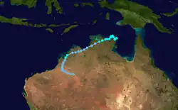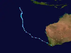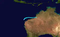 Gladys formed over Western Australia, to the south-southwest of Derby. It moved offshore on the same day and moved to the west before it was last noted dissipating to the north-northwest of Exmouth.