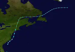 An upper-level trough and attendant frontal boundary moved into the western Atlantic on September 8. The next day, an area of low pressure formed on the tail-end of this front and began to organize as it moved westward. Surface observations suggested the formation of a tropical depression by 00:00 UTC on September 10. The newly formed system curved north-northeast in advance of another trough and intensified into a tropical storm while passing offshore the Carolinas. On September 11, it attained peak winds of 65 mph (100 km/h), a strength it maintained while making landfall in Long Island, New York, around 10:00 UTC that day. A few hours later, the storm transitioned into an extratropical cyclone as it became intertwined with a front. It crossed Newfoundland into the North Atlantic, interacting with another non-tropical low before dissipating on September 17.[5]