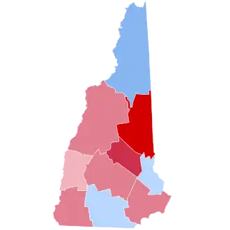 | Coös | 6,822 | 44.02% | 8,261 | 53.31% | 399 | 2.57% | 15 | 0.10% | -1,439 | -9.29% | 15,497 |