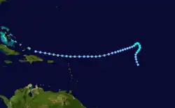 A tropical wave exited the west coast of Africa September 24, and for several days maintained a general westward track. On September 30, a flight from the Hurricane Hunters observed a well-defined circulation, while ships in the area reported gale-force winds; these observations indicated that a tropical storm had developed. The storm moved west-southwestward, passing St. Lucia and St. Vincent into the Caribbean Sea on October 2. It weakened thereafter, briefly degenerating into a trough before redeveloping into a tropical depression on October 5. It re-intensified into a tropical storm as it meandered south of Hispaniola, eventually hitting the Dominican Republic on October 8 as a tropical depression. It crossed the island into the Atlantic and moved northeastward ahead of an approaching cold front, briefly becoming a tropical storm again on October 10. The storm became extratropical as it integrated with the trough on October 11, moving quickly to the east and east-northeast. Thunderstorms increased on October 14, and a day later, the stalled about halfway between the Azores and Madeira due to a ridge over northern Europe. By that time, the system became integrated with an upper-level low while no longer associated with the front; as a result, it became a subtropical storm. Turning back to the west, the storm re-intensified, becoming a fully tropical hurricane on October 17. A day later, it attained peak winds of 85 mph (135 km/h). The hurricane turned to the north, weakening back to a tropical storm on October 20. A day later, it transitioned into an extratropical cyclone, which was absorbed by another cyclone southeast of Greenland on October 22.[21]