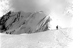 On 12 April, after Bonington had organised the logistics of establishing and equipping Base Camp, he and Frost set from there so that on 14 April they could start to prospect a route up the Ice Ridge above Camp III. After investigating a snow shelf leading to a gully on the west of the ridge, Bonington decided avalanches posed too great a threat, so he joined Frost, who was ascending along the actual crest of the ridge. However, this turned out to be much more difficult than they had expected, with snow too soft and loose for firm piton placements; there would be a need to set fixed ropes all the way up the ridge. Also, they had not formed a plan for placing fixed ropes – should the lead climber fix his rope or should he climb normally leaving the second climber to pay out a rope from his rucksack, fixing it as he climbed? To begin with, the latter method seemed more successful, but progress was dreadfully slow with Bonington never having previously encountered such appalling snow.[63] Later in the expedition, the technique changed, and they climbed using their 9-millimetre (0.35 in) fixed rope which they then secured with pitons and karabiners, not using their 11-millimetre (0.43 in) climbing rope at all.[64]