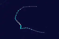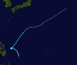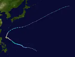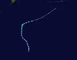 During January 8, the JMA started to monitor a tropical depression that had developed, about 500 km (310 mi) to the east of Ngerulmud, Palau.[3] Over the next day the system gradually developed further as it moved north-westwards, before it was classified as a tropical storm and named Sarah by the JTWC, after a US Navy plane had found an organised system.[3][4] The system subsequently recurved north-eastwards, before it was classified as a Severe Tropical Storm by the JMA during January 10.[5] During that day, the JTWC reported that the system had peaked, with 1-minute sustained wind-speeds of 95 km/h (60 mph).[4] Over the next day, the system quickly weakened and became an extratropical cyclone during January 11.[4] Sarah's extratropical remnants were subsequently tracked as they moved north-eastwards, until it made landfall on Canada and broke up over the mountains of British Columbia during January 17.[4]