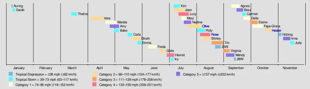 Hester (Goying) October 18 – 24 Typhoon 970 hPa (28.64 inHg) Philippines, North Vietnam, South Vietnam, Laos >$3.6 million 119