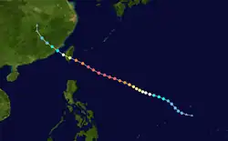 On April 23 Tropical Storm Wanda began its life to the east of the Philippines. It tracked over the archipelago, and emerged into the South China Sea on the 25th. It turned to the northwest, and became a typhoon on May 1 just off the coast of South Vietnam. The westerlies brought Wanda to the north and northeast, where it weakened until dissipating on the 4th near Hainan Island.