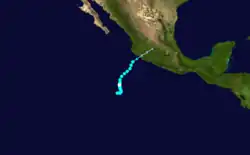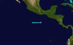 On October 18, a vortex in the Intertropical Convergence Zone was determined to be a tropical storm through the use of satellite pictures.[4] Kathleen was a tropical storm for only eighteen hours before weakening into a tropical depression and recurving to the northeast.[1] The tropical cyclone dissipated on October 19 while out to sea west of Puerto Vallarta. No deaths or damages were reported.[4]