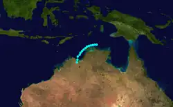 Cyclone Tracy devastated the city of Darwin, Northern Territory, Australia, from Christmas Eve to Christmas Day, 1974. It is the most compact cyclone or equivalent-strength hurricane on record in the Australian basin, with gale-force winds extending only 48 kilometres (30 mi) from the centre and was the most compact system worldwide until Tropical Storm Marco of the 2008 Atlantic hurricane season broke the record, with gale-force winds extending only 19 kilometres (12 mi) from the centre.[3][4] After forming over the Arafura Sea, the storm moved southwards and affected the city with Category 4 winds on the Australian cyclone intensity scale, while there is evidence to suggest that it had reached Category 3 on the Saffir–Simpson hurricane scale when it made landfall.[5]