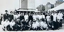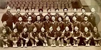 In mid-1973, the Sports Commission and the CWA created a committee to create the first national wushu team. The committee was split into two groups, one headed to the north and the other to the south. The committees assessed the abilities of wushu athletes from various provinces. 120 individuals were selected to begin training at the Beijing Worker's Stadium. In October after two months of training, 18 male and 12 female athletes were selected to join the national team. These athletes were relocated to the Shanghai University of Sport where they trained for six months.[15] The head coach was Guo Lei with assistant coaches Zhang Shan and Wang Jiadong.[16] Besides practicing wushu, the delegation met with British instructors for six months to learn American customs and manners.[17]