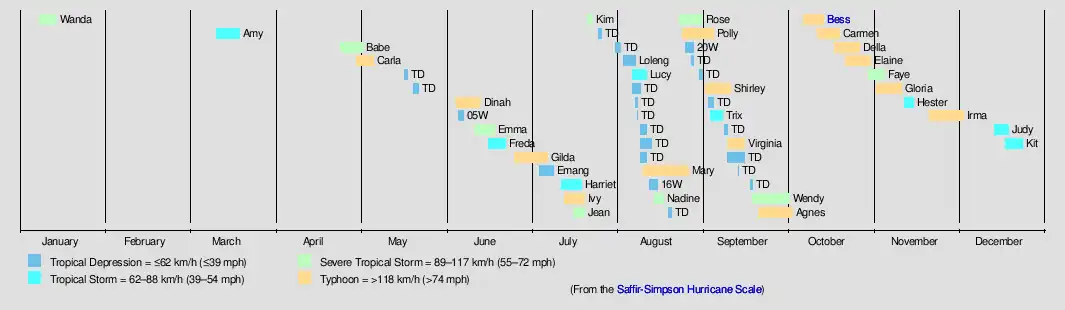 Agnes September 21 – October 3 Typhoon 195 km/h (121 mph) 960 hPa (28.35 inHg) None None None