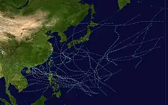 35 tropical depressions formed this year in the Western Pacific, of which 32 became tropical storms. 16 storms reached typhoon intensity, and none reached super typhoon strength.[1] This season is the most recent to have no super typhoons.[2]