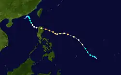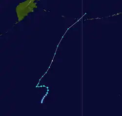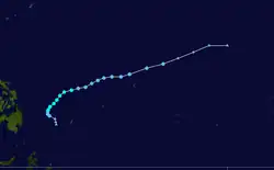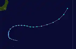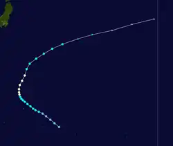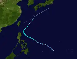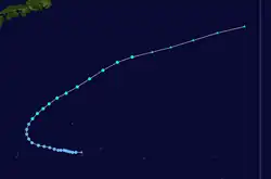 A tropical disturbance developed on January 8 to the southwest of Palau.[1] By the next day, the disturbance was upgraded to a tropical depression and to a tropical storm. Wanda reached its peak intensity on January 10 as a 65 mph tropical storm. The storm was then downgraded to a tropical depression on January 11. Wanda then dissipated on January 14.[3]