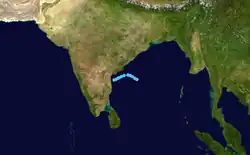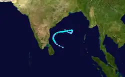 Cyclone Sixteen formed on 19 October and began to intensify, peaking as a Very Severe Cyclonic Storm or as a Category-1 equivalent storm on October 21. The storm made landfall at Porbandar in Gujarat at peak intensity on 22 October. Sixteen dissipated on October 24.[3][4]