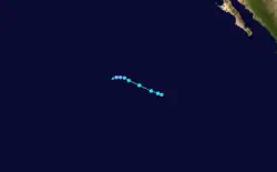 On July 24, a large area of disturbed weather developed about 1,035 miles (1,666 km) southwest of Acapulco, Guerrero. This complex became composed of two distinctly separate areas of low pressure late on July 26.[2] The eastern circulation organized into a tropical depression around 00:00 UTC on July 27 and further strengthened into Tropical Storm Estelle six hours later. Moving swiftly toward the west, the system failed to intensify beyond minimal tropical storm intensity, instead weakening to a tropical depression again by 06:00 UTC on July 28 as it moved into cooler waters. After losing its convective structure, Estelle dissipated around 00:00 UTC on July 29.[2][3]