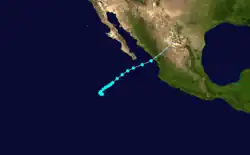 A tropical disturbance was first noted about 345 miles (555 km) south of the Guatemalan coastline on September 27.[2] It organized into Tropical Storm Madeline by 00:00 UTC on September 29 but failed to further develop, instead weakening to a tropical depression the next morning. By 00:00 UTC on October 4, Madeline re-intensified into a tropical storm, beginning a gradual curve toward the north as well. The system continued to strengthen and became a hurricane early on October 6; by 06:00 UTC on October 8, Madline peaked as a Category 4 hurricane with winds of 145 mph (233 km/h). It moved onshore the coastline of Mexico a few hours later, rapidly weakening and losing its status as a tropical cyclone after 18:00 UTC that day.[3]