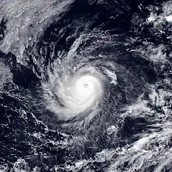 An area of disturbed weather within the ITCZ developed into Tropical Storm Susan around 00:00 UTC on October 18.[7] The storm intensified over subsequent days, becoming a hurricane around 00:00 UTC on October 20 and further developing into a major hurricane by 18:00 UTC the next day. Susan attained Category 4 strength with winds of 130 mph (210 km/h) six hours later,[6] one of the strongest on record in the Central Pacific at that time. Although the powerful hurricane initially tracked northwest toward Hawaii, it sharply veered toward the southwest while succumbing to strong wind shear.[7] Susan weakened rapidly, with winds falling from 115 to 35 mph (185 to 56 km/h) within 24 hours, and dissipated after 00:00 UTC on October 24.[6]