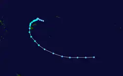 During January 9, the extratropical remnants of Tropical Cyclone Paul briefly moved into the region, before they moved back into the Australian region during the next day.[3][1] The remnants subsequently moved back into the region during January 12, when they were last noted to the south of New Zealand's South Island.[3] The precursor tropical depression to Severe Tropical Cyclone Simon, developed within the monsoon trough, to the northeast of New Caledonia during February 20.[1] Over the next day the system moved eastwards and into the Australian region, where it ultimately developed into a severe tropical cyclone and impacted Queensland.[3][1] During February 28, Simon's extratropical remnants moved back into the basin and impacted New Zealand, before they were last noted during March 3.[3][1]
