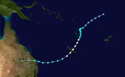 Initially a South Pacific tropical cyclone, Cliff developed on February 9, near Vanua Lava, Vanuatu. The cyclone reached peak intensity on February 12, with an estimated central pressure of 975 hPa. It passed over New Caledonia at near peak intensity, with sustained winds 92 km/h (57 mph). After crossing into the Australian region, Cliff struck Queensland on February 14, making landfall near Bundaberg. The cyclone caused some crop and structural damages in South East Queensland, and beach erosion occurred on the Gold and Sunshine coasts. One man was drowned off the Gold Coast.[4]