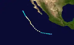 A tropical disturbance south of Acapulco developed into a tropical depression on September 16 and a tropical storm later that day. Kay headed in an irregular but generally west-northwest path out to sea. Kay strengthened into a hurricane on September 17. It continued strengthening and reached its peak as a Category 4 hurricane on the Saffir–Simpson scale on September 18. Kay then slowly weakened and was a tropical storm by September 20. Kay's forward motion slowed as it neared the central Pacific. It restrengthened into a hurricane on September 23, crossed 140°W, and entered the Central Pacific Hurricane Center's area of responsibility the next day.[2] Kay executed a small anticyclonic loop, and then began weakening again. It became a tropical storm again on September 27, and a depression two days later. The cyclone dissipated on September 30 while located north of the Hawaiian Islands.[4] Kay did not effect land, causing no damage or casualties.[2] It was the strongest tropical cyclone of the season at 140 mph (225 km/h). Kay lasted for 14.5 days, enough to make it the fifth-longest-lasting Pacific hurricane at the time.[4]